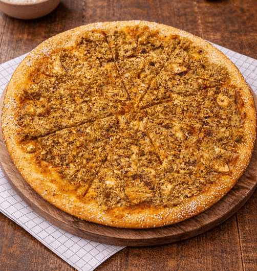 פיצה בגודל משפחתי עם שומשום בשוליים עם בסיס רוטב חריף פיקנטי עם עוף מתובל