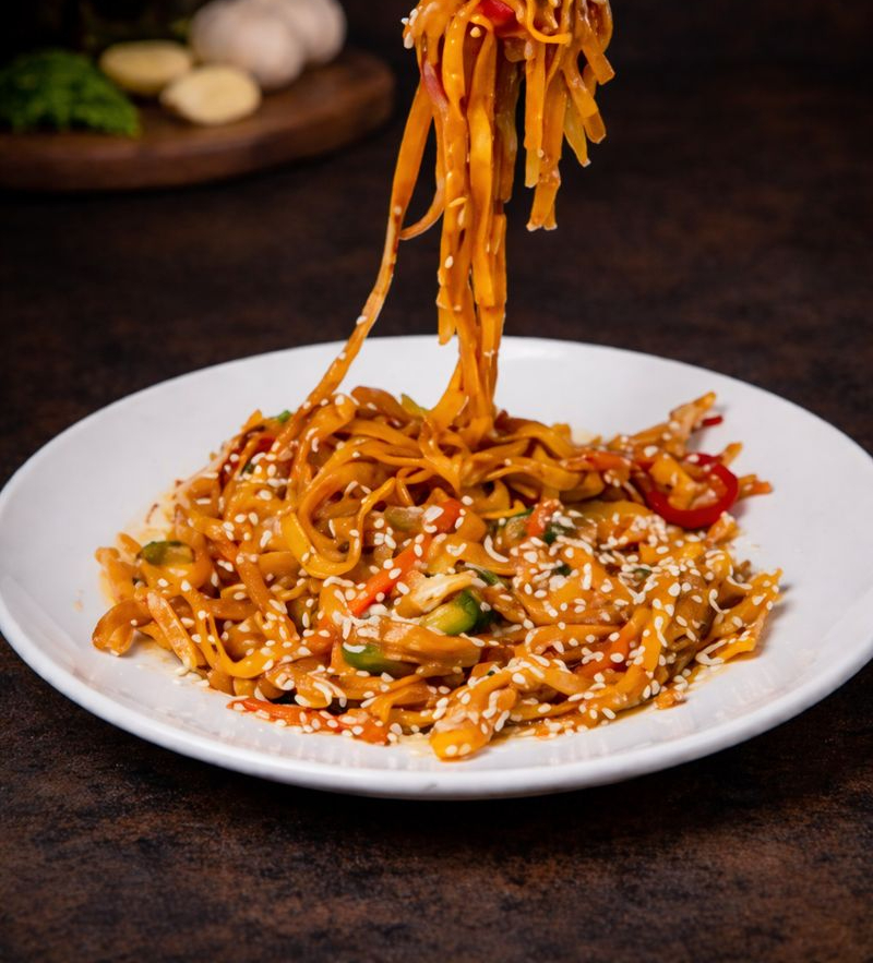 פסטה עם מבחר ירקות (בצל-גמבה-פטריות-כרוב-גזר)מוקפצים ברוטב המיוחד שלנו