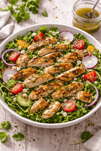 חסה,בצל סגול,מלפפון,עגבניות שרי, גזר,חזה עוף 230 גרם חזה עוף במנה (משקל לפני צליה)