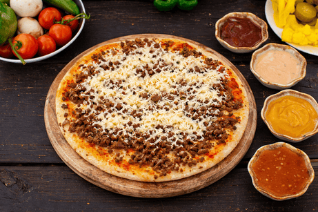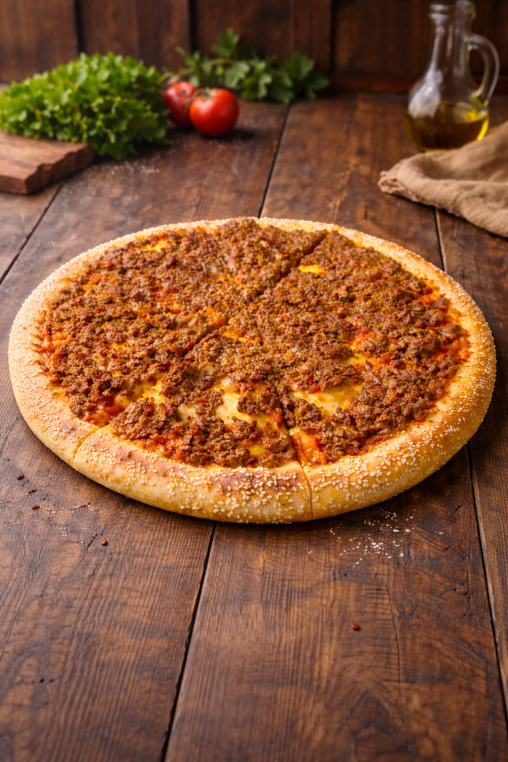 פיצה בגודל משפחתי עם שומשום בשוליים עם בסיס רוטב חריף פיקנטי עם בשר עגל טחון