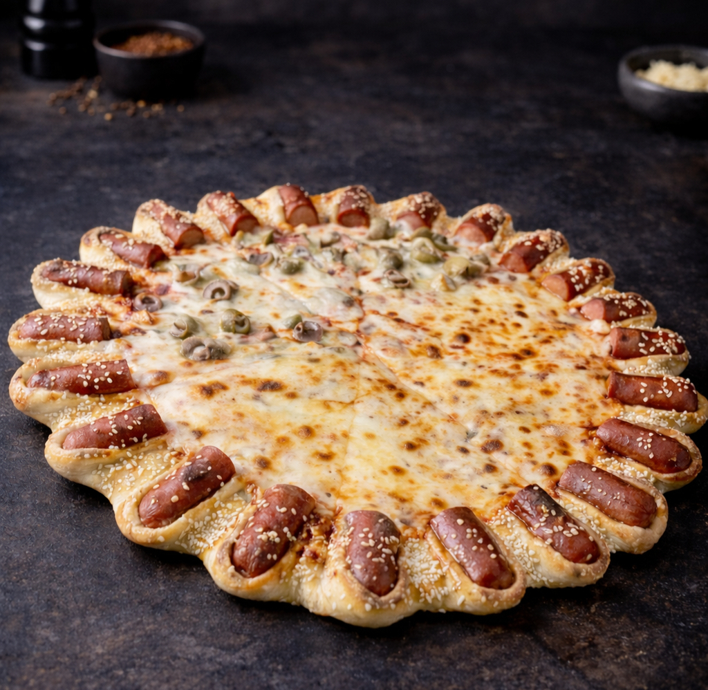 פיצה מיוחדת בגודל משפחתי עם נקנקיות טעימות בשוליים